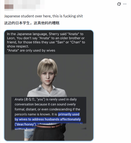 但实际上,雪莉在游戏中基本都是直呼里昂的名字,称呼其为“你”的场景,仅出现在“啊,太好了,你没事”等特定台词中。一位自称是日本学生的英语用户指出,“雪莉是里昂妻子”的说法十分离谱。