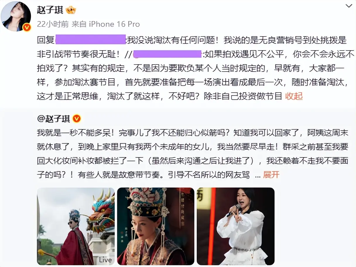 其实到这里,事情还没到无法挽回的程度,偏偏赵子琪不停在网上阴阳节目组,愣是把好不容易积累的观众缘,一点点消耗殆尽了。