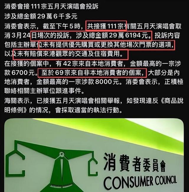 歌迷的愤怒,最终化作了实际的维权行动。据香港消委会公布的数据,截至 3 月 12 日下午 5 时,已经接到 111 宗相关投诉,涉及总金额高达 296194 港币。其中 42 宗是香港本地投诉,最高单宗损失 6700 港币;69 宗来自非本地歌迷,且绝大多数是内地粉丝,最高一单损失 8000 港币。这些数字背后,是一个个被辜负的期待,更是真金白银的损失。而歌迷的投诉诉求也很明确:要么赔偿机酒等实际损失,要么提供优先更换 29 日场次门票的选项。