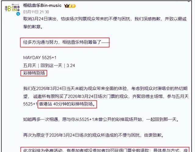 眼看粉丝群彻底炸锅,五月天所属的相信音乐终于在 3 月 11 日晚出面道歉,还推出了所谓的补偿方案:3 月 24 日当天在原场馆举办一场 40 分钟的 “从未公开的彩排特别场”,无论歌迷是否到场,都能拿到门票全款退款。声明里写得情真意切,说想和歌迷 “从彩排现场开始,一起回到那一天”,可这份看似有诚意的补偿,在歌迷眼里却满是敷衍。